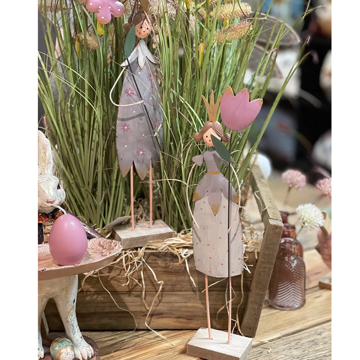 Deko Blumenmädchen mit Blume, Blumenkönigin creme und grau, 36x12cm, Metall, Set/2