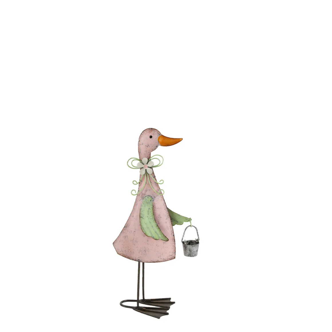 Deko Ente mit Eimer, rosa, 20cm, Metall