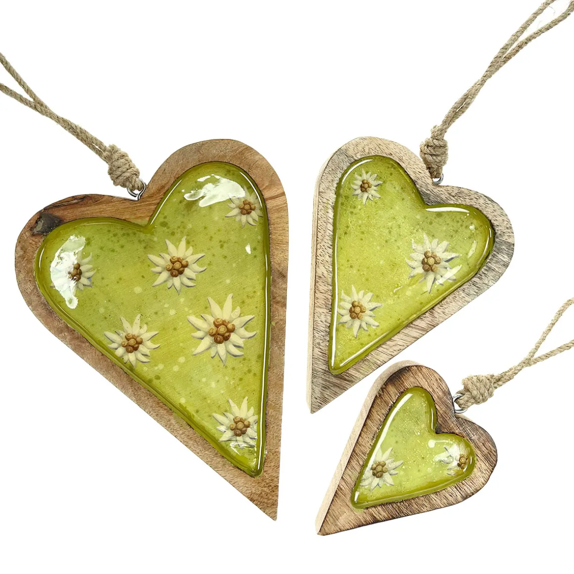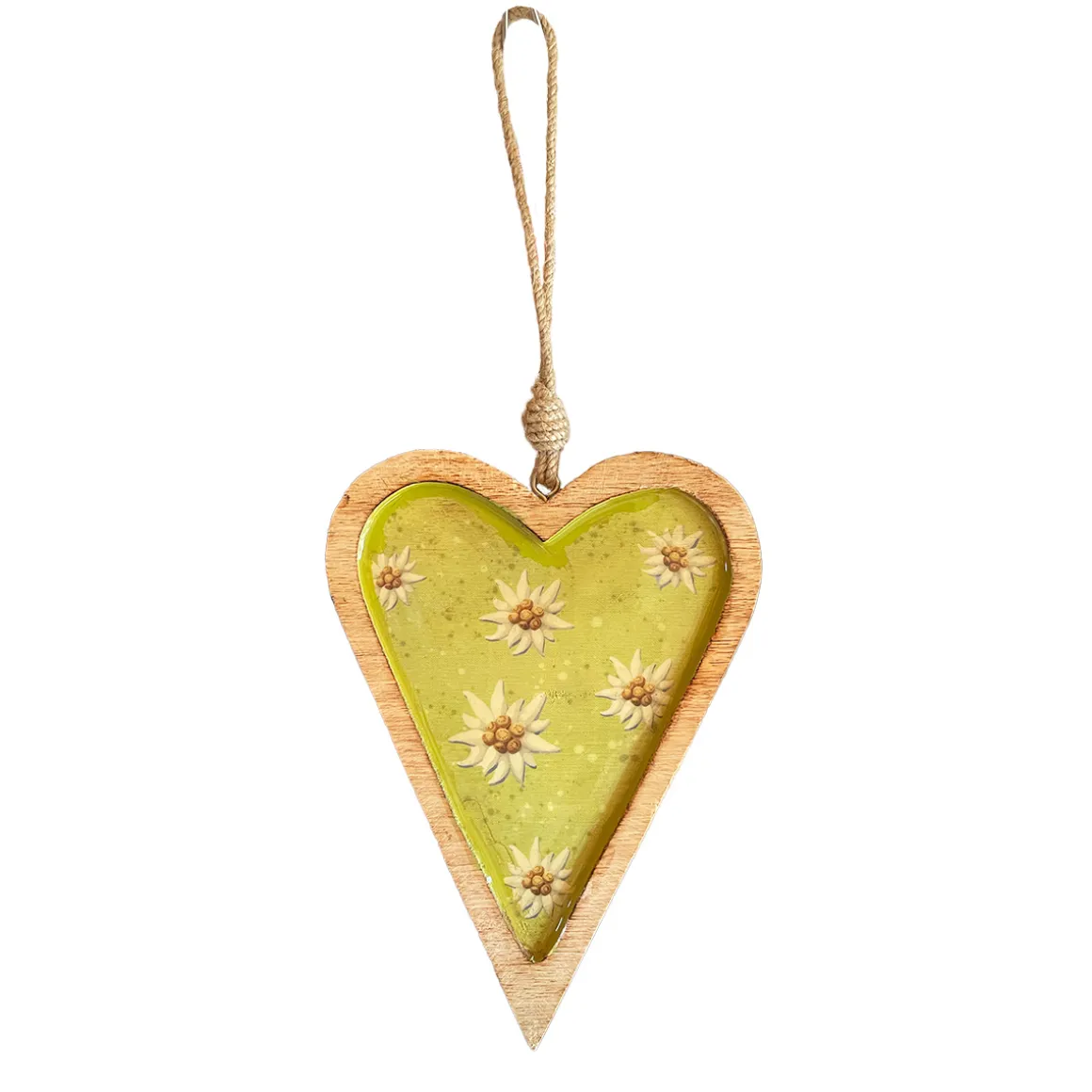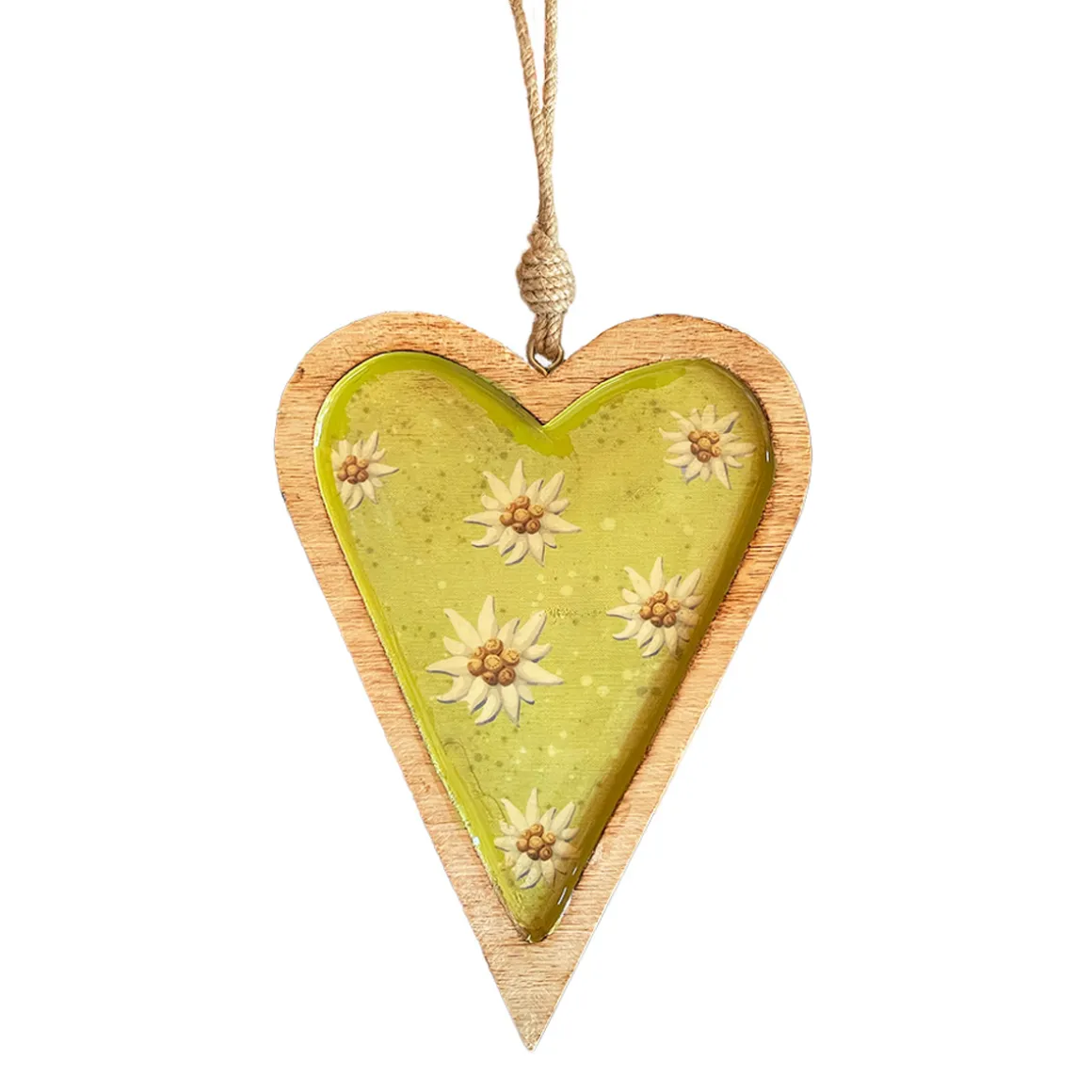 Deko Herz Landhaus, Holzherz hellgrün mit Edelweiß, Emailleoptik, 14x19cm, Hänger