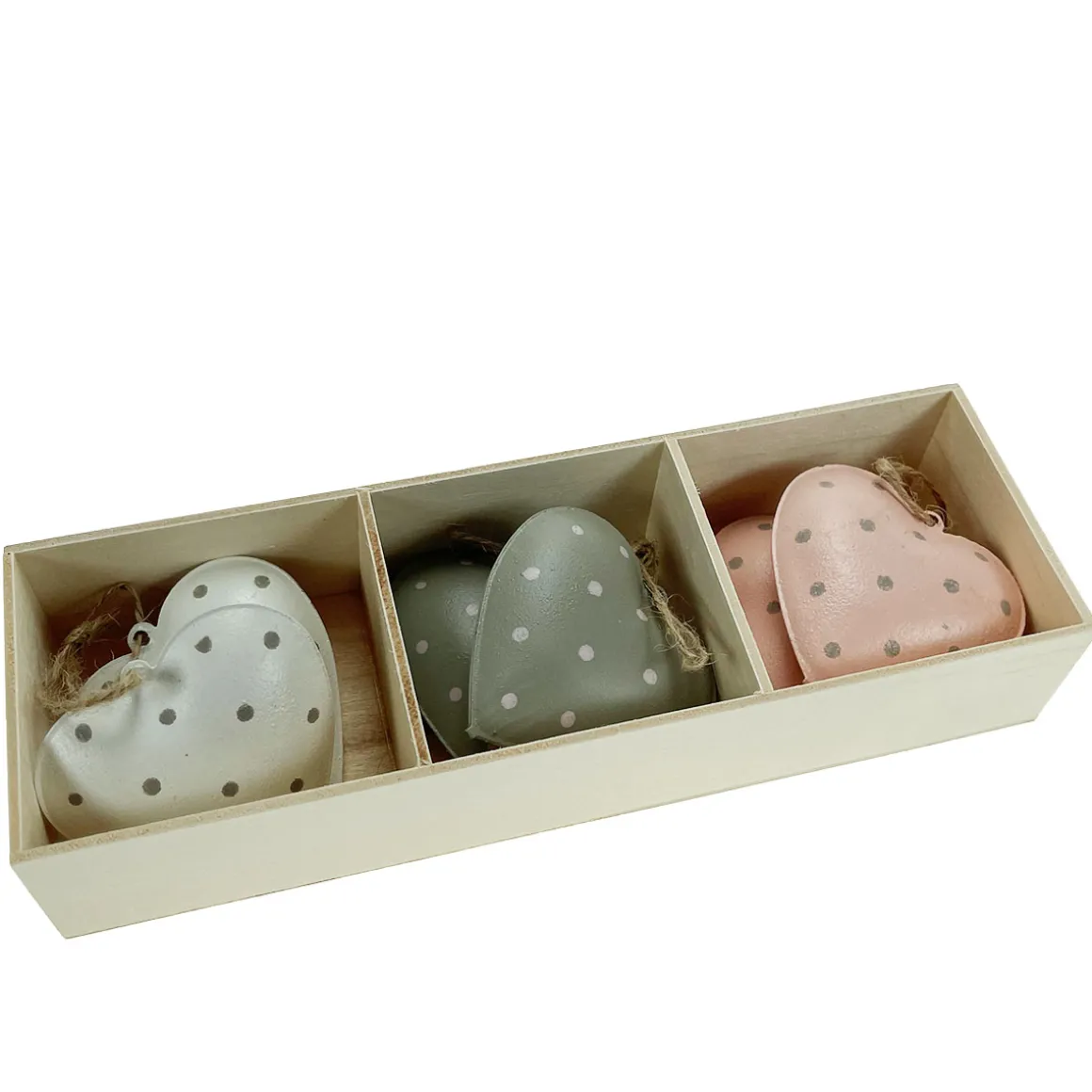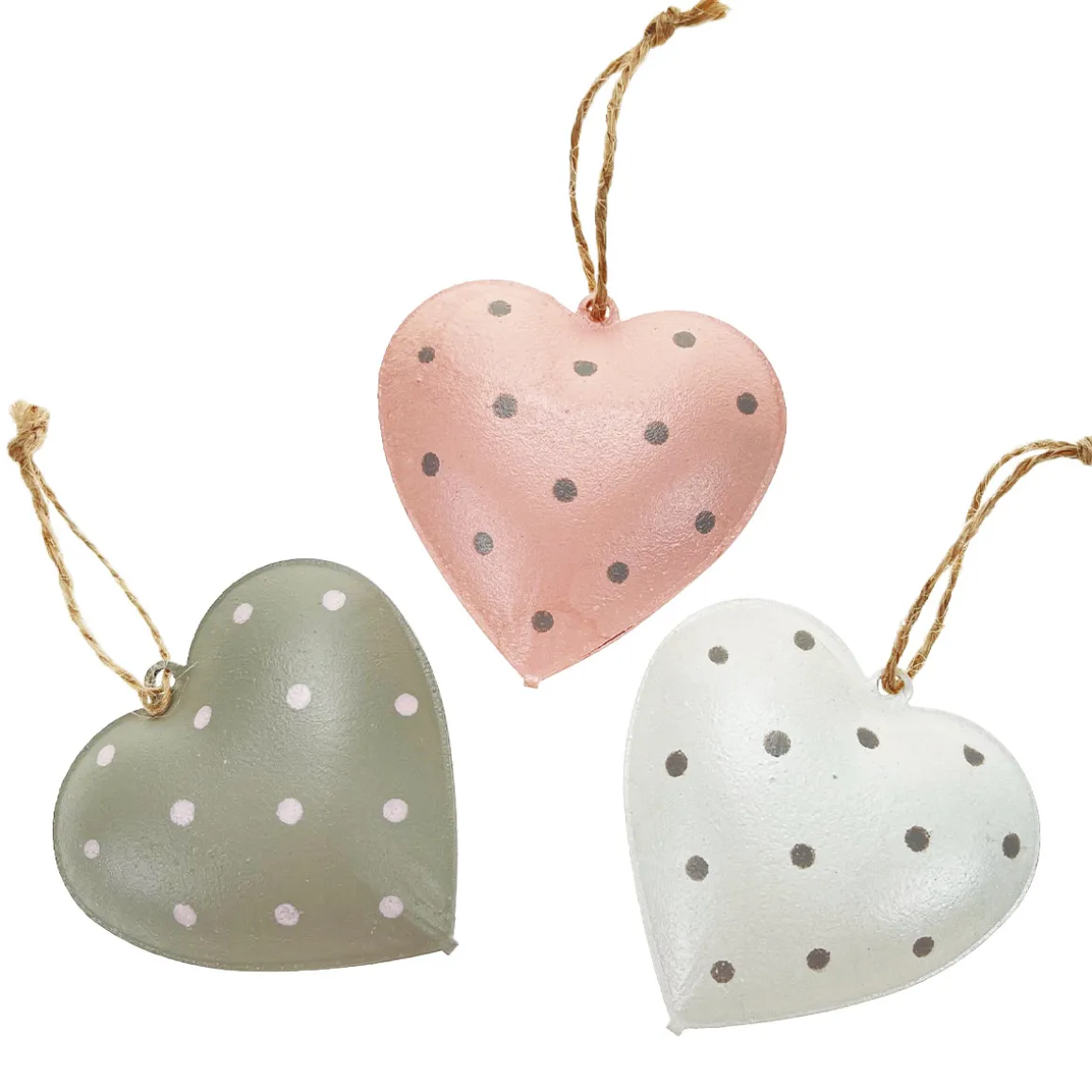 Deko Herz, Metallherze mit Punkte und Klang, rosa, grau, weiß, 3- fach sortiert, 6 St/Box, Hänger