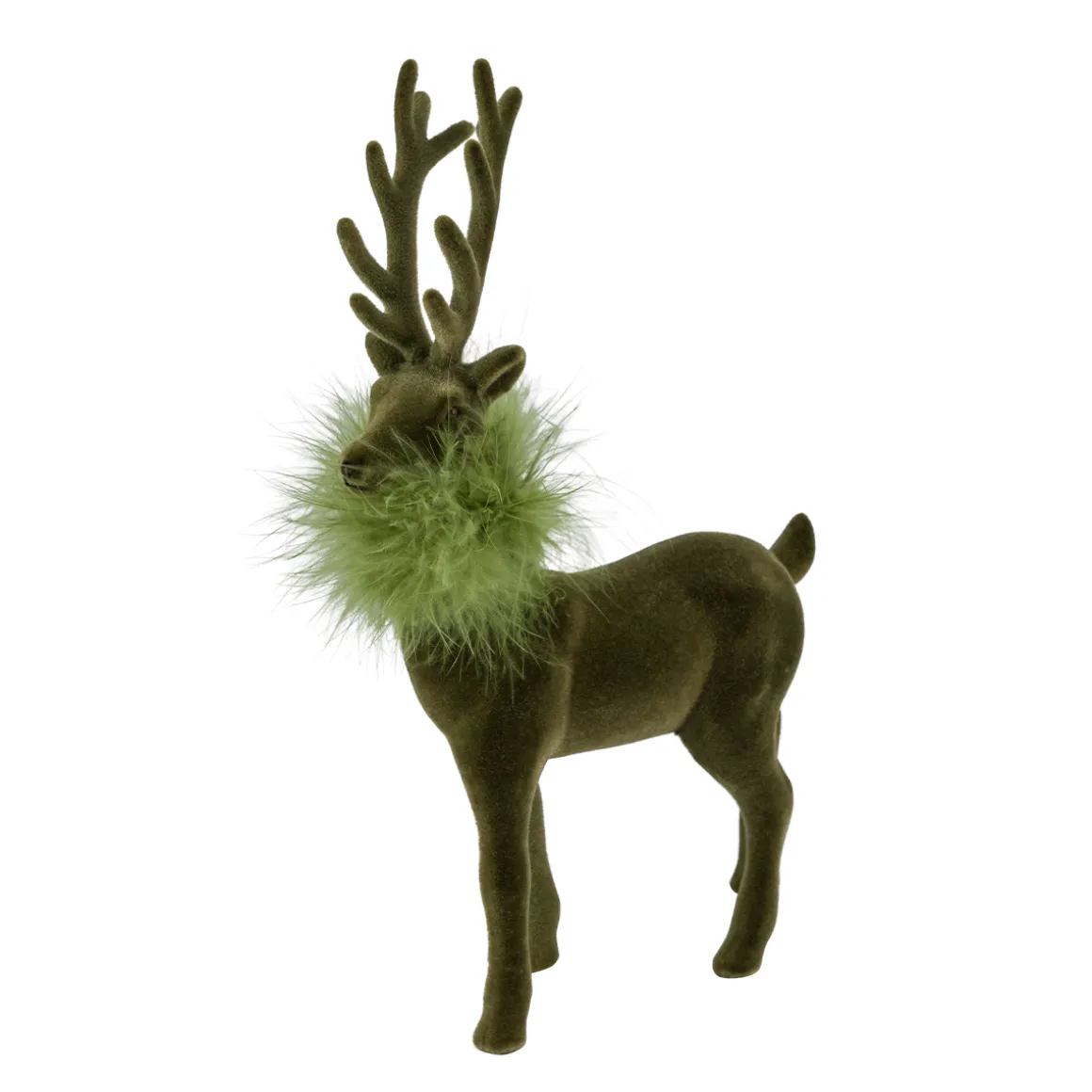 Deko Hirsch mit Federboa, großer olivgrüner Hirsch, samtig beflockt, 45cm