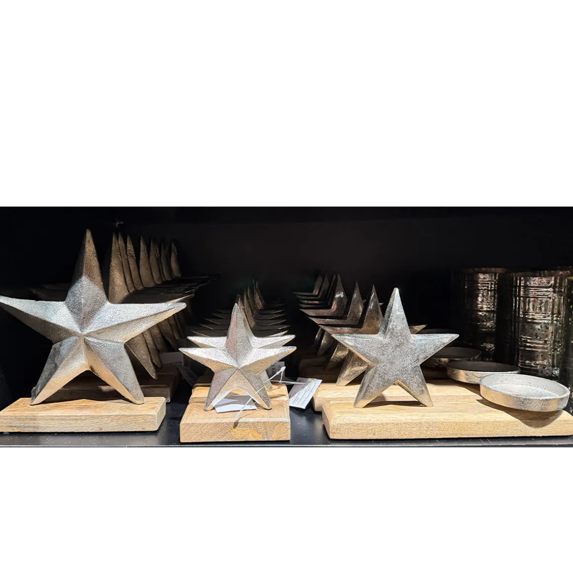 Die silbern glänzende, leicht strukturierte Oberfläche wirkt edel, ohne zu protzen, während das natürliche Holz für eine warme, bodenständige Note sorgt – perfekt für die Winter- und Weihnachtszeit.