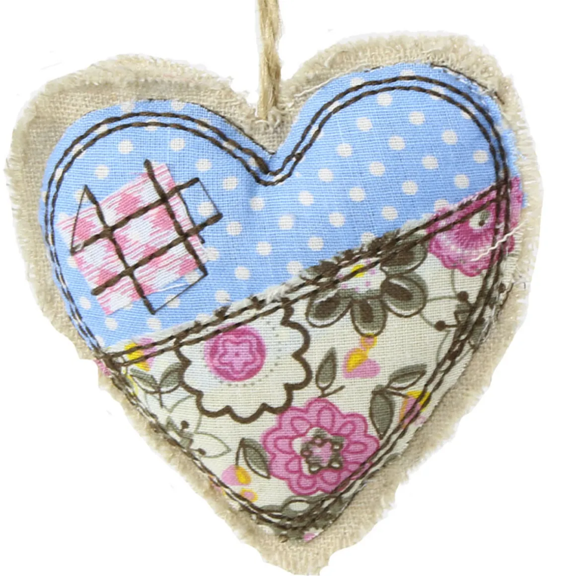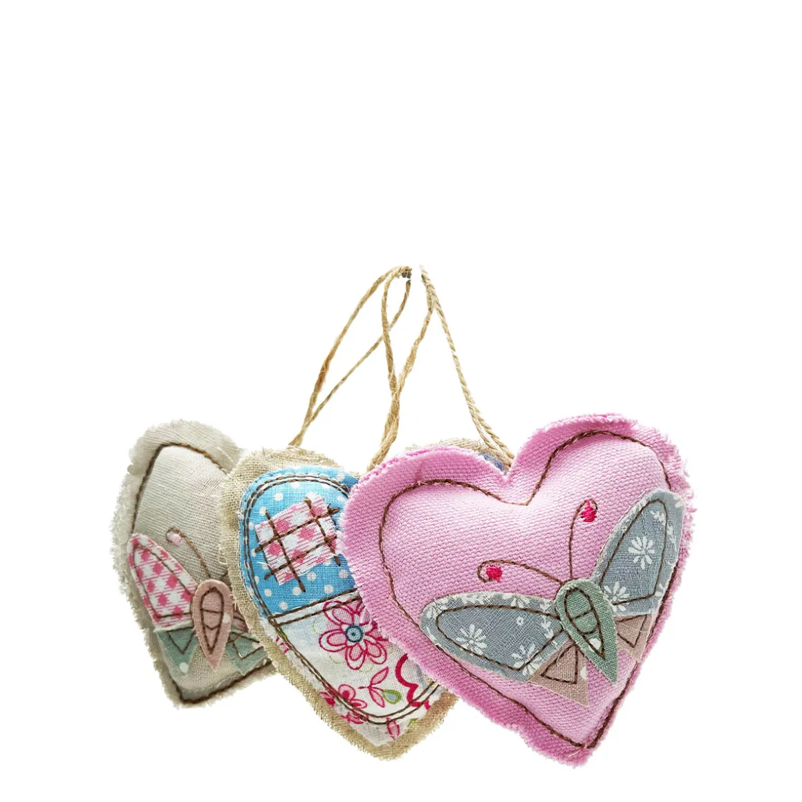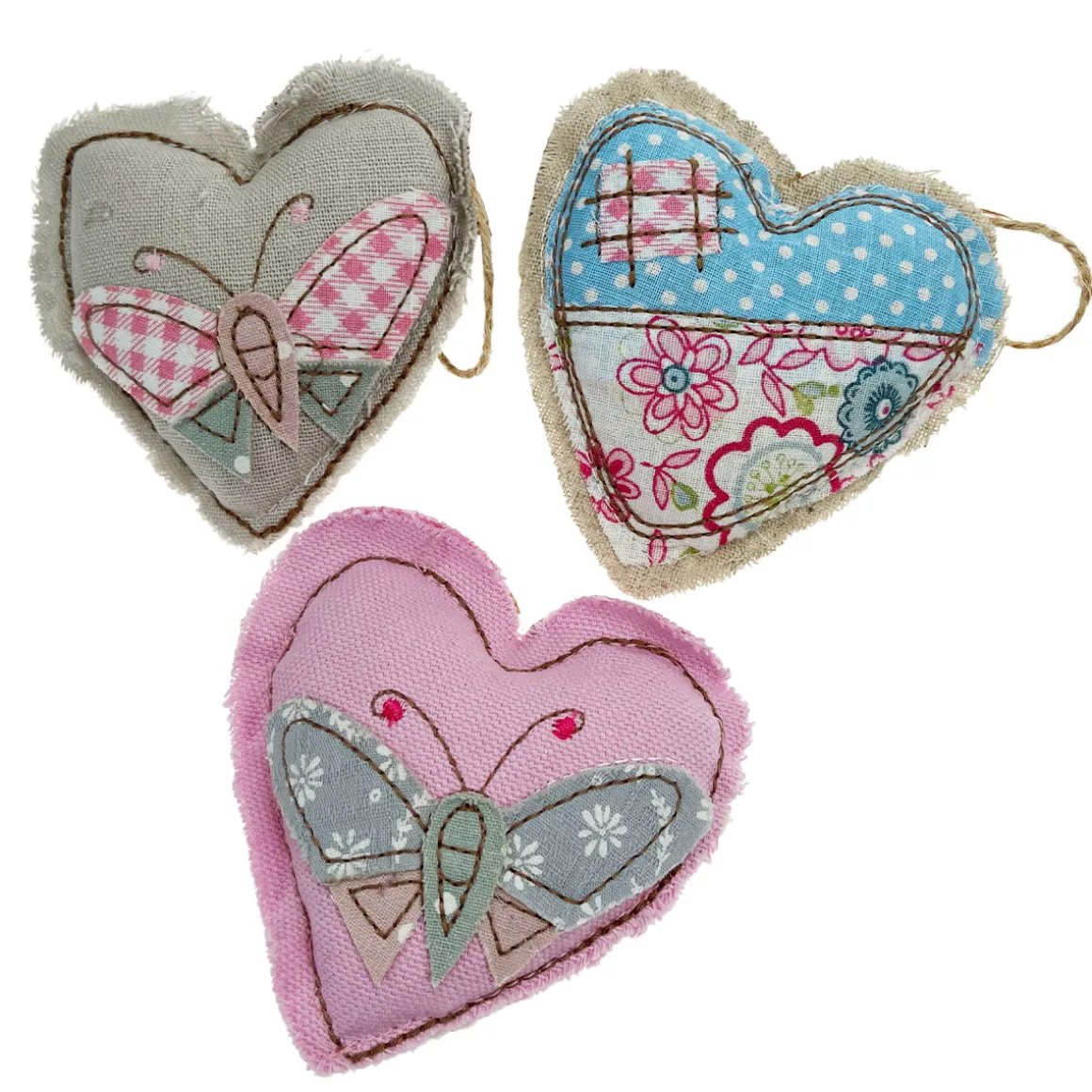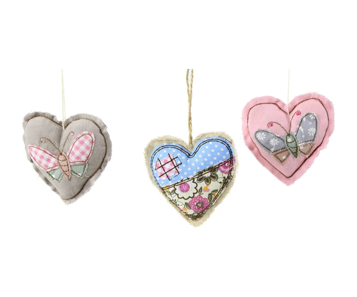 Deko Stoff-Herz, mit Schmetterlinge, Blumen, 3fach sortiert, 9x9cm, Hänger