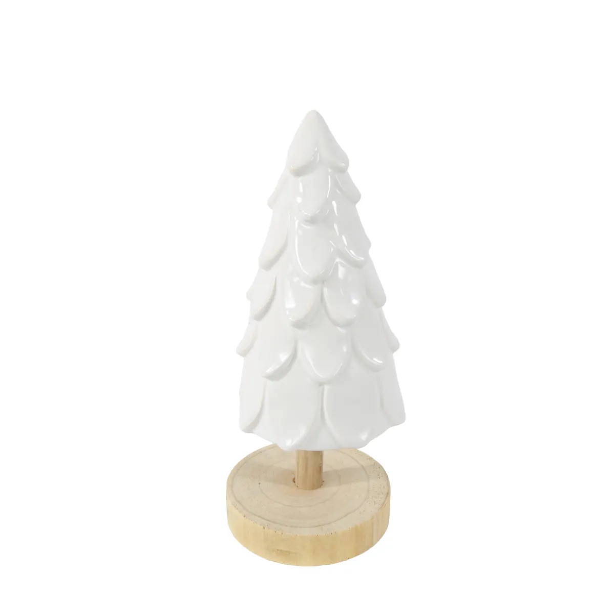 Deko Tannenbaum, weißer Keramikbaum auf Holzfuß, 22cm