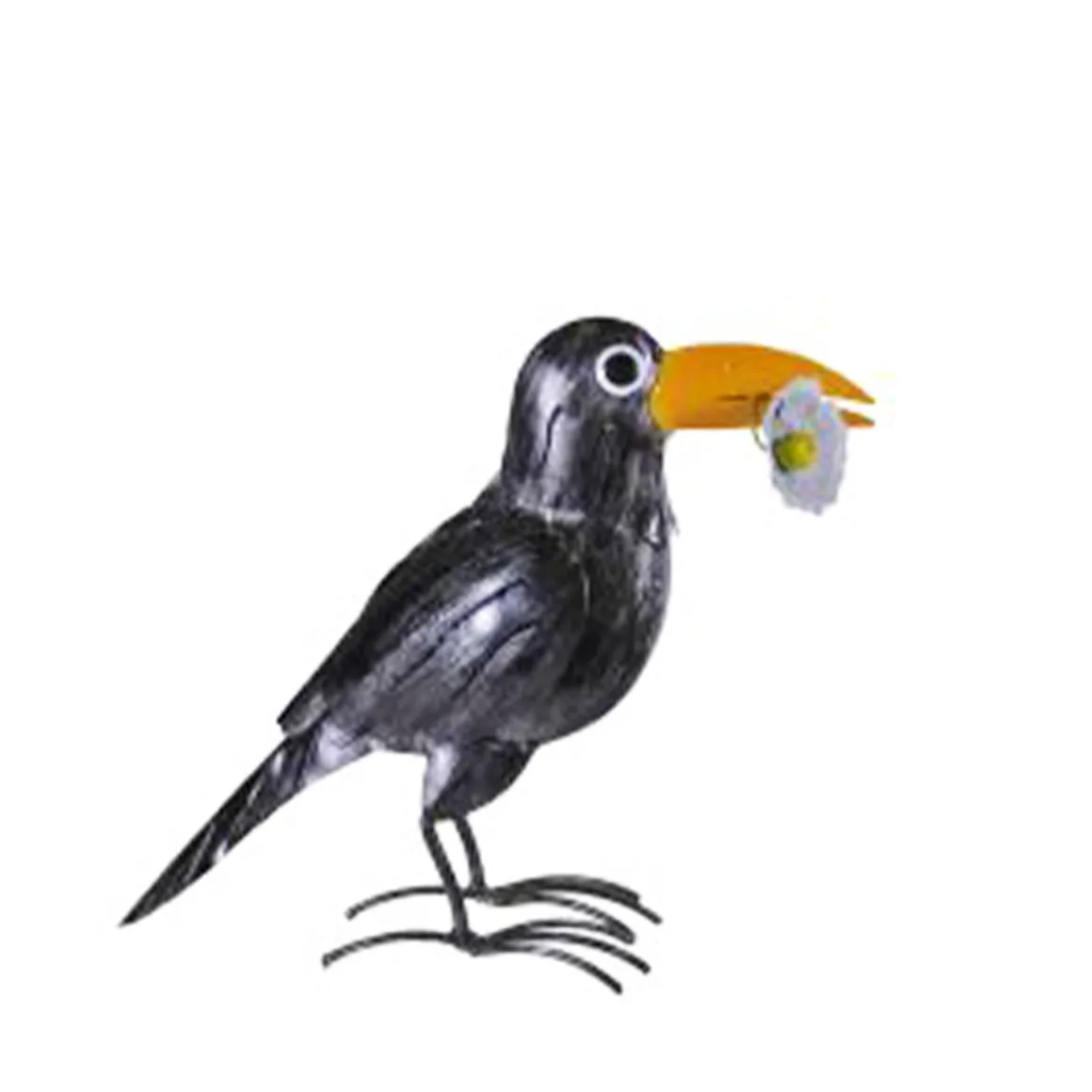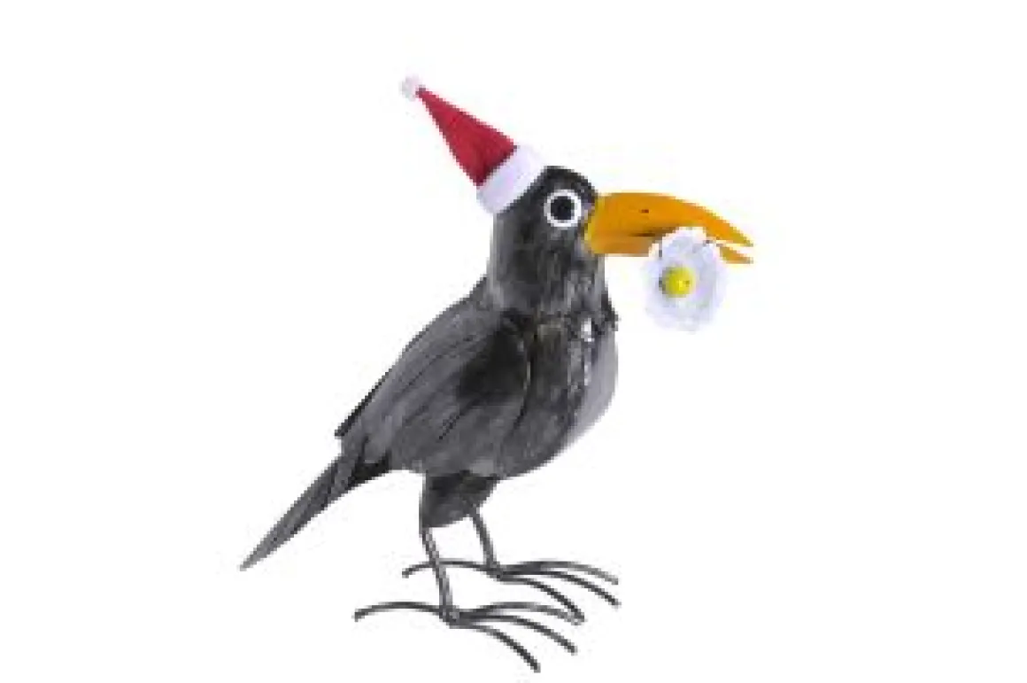 Dieser dekorative Metallrabe bringt mit seinem charmanten Look und der kleinen Blume im Schnabel eine humorvolle und zugleich stilvolle Note in deine Deko.