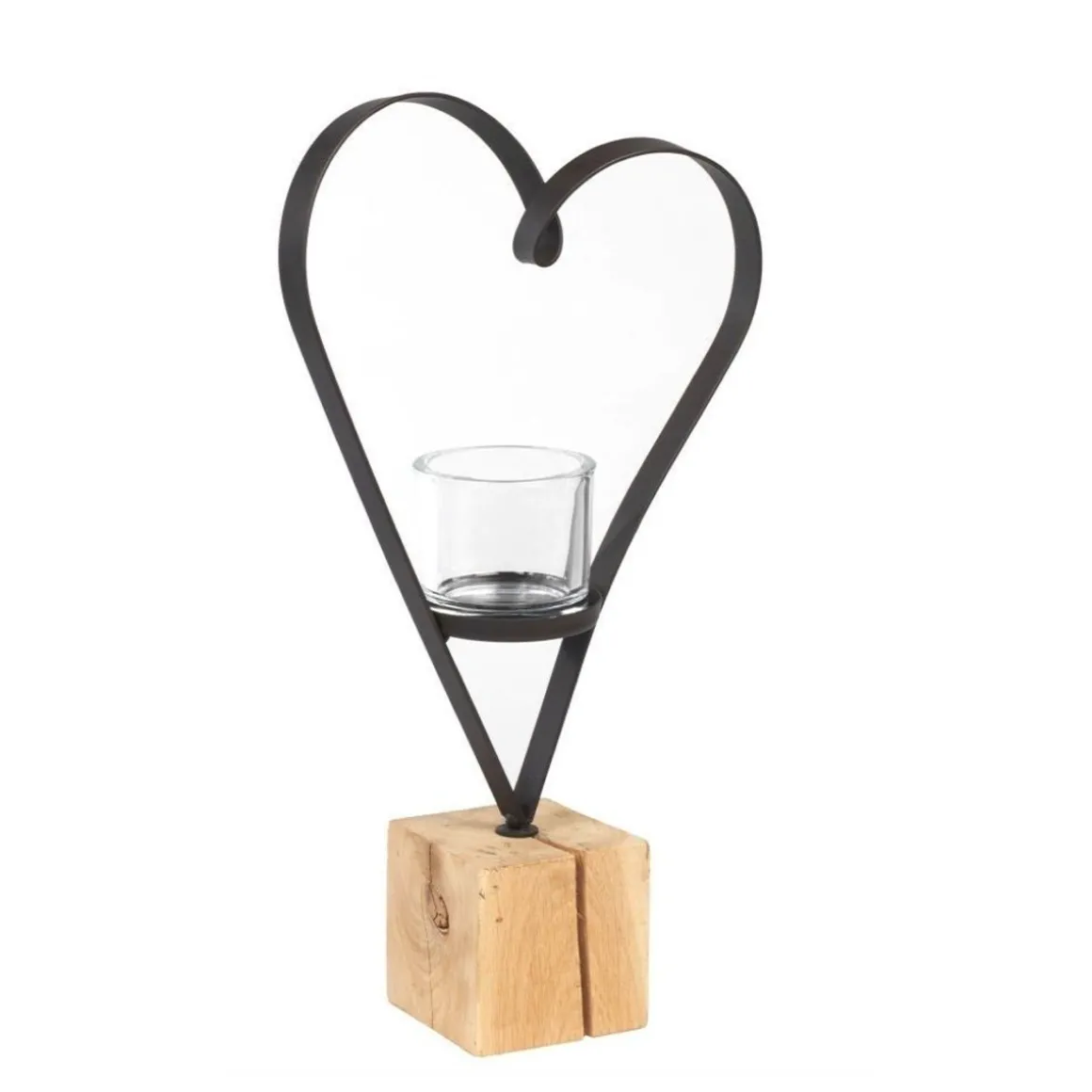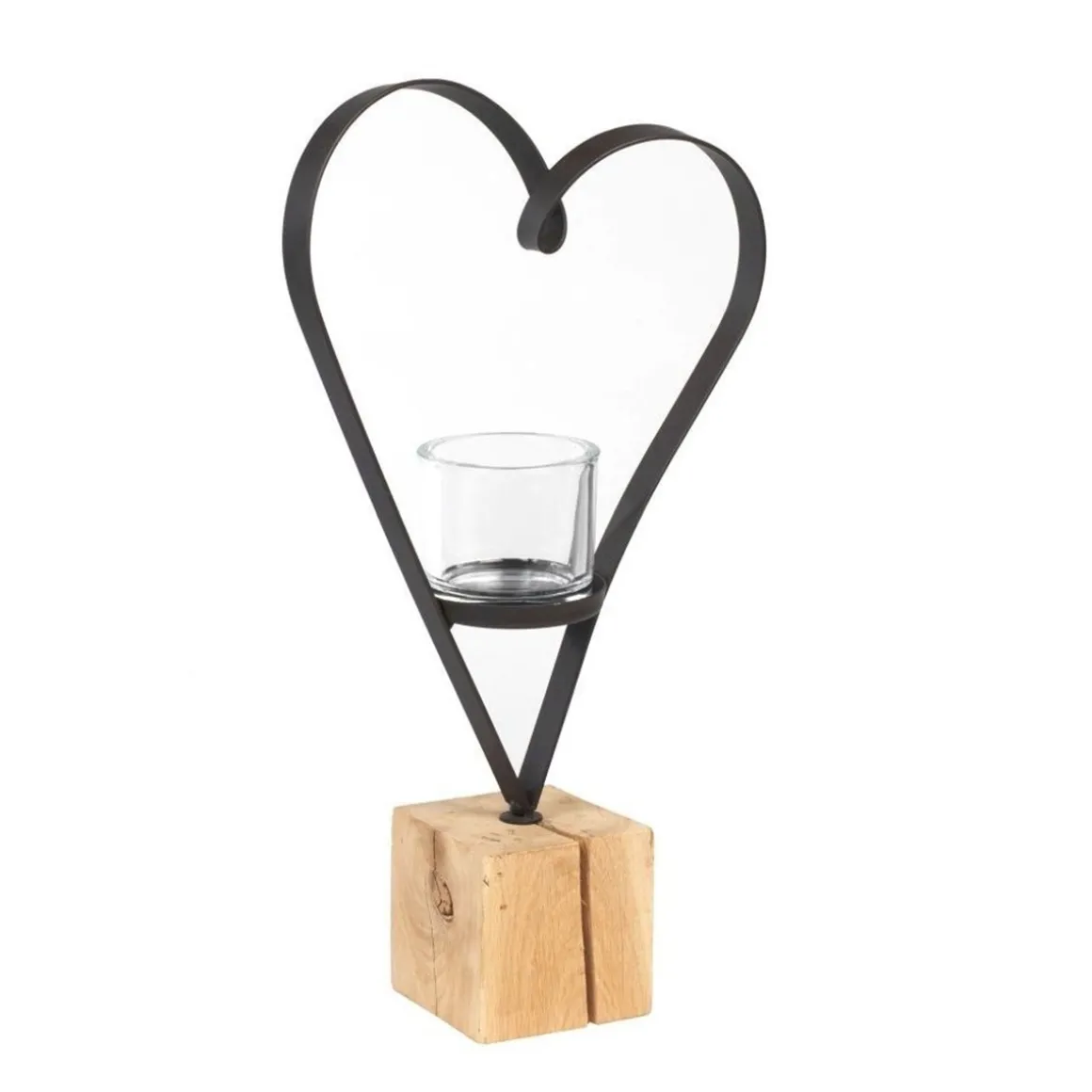 Deko Windlicht Herz Diana, geschwungenes Metallherz auf Naturholzwürfel, 55cm, WMG Grünberger
