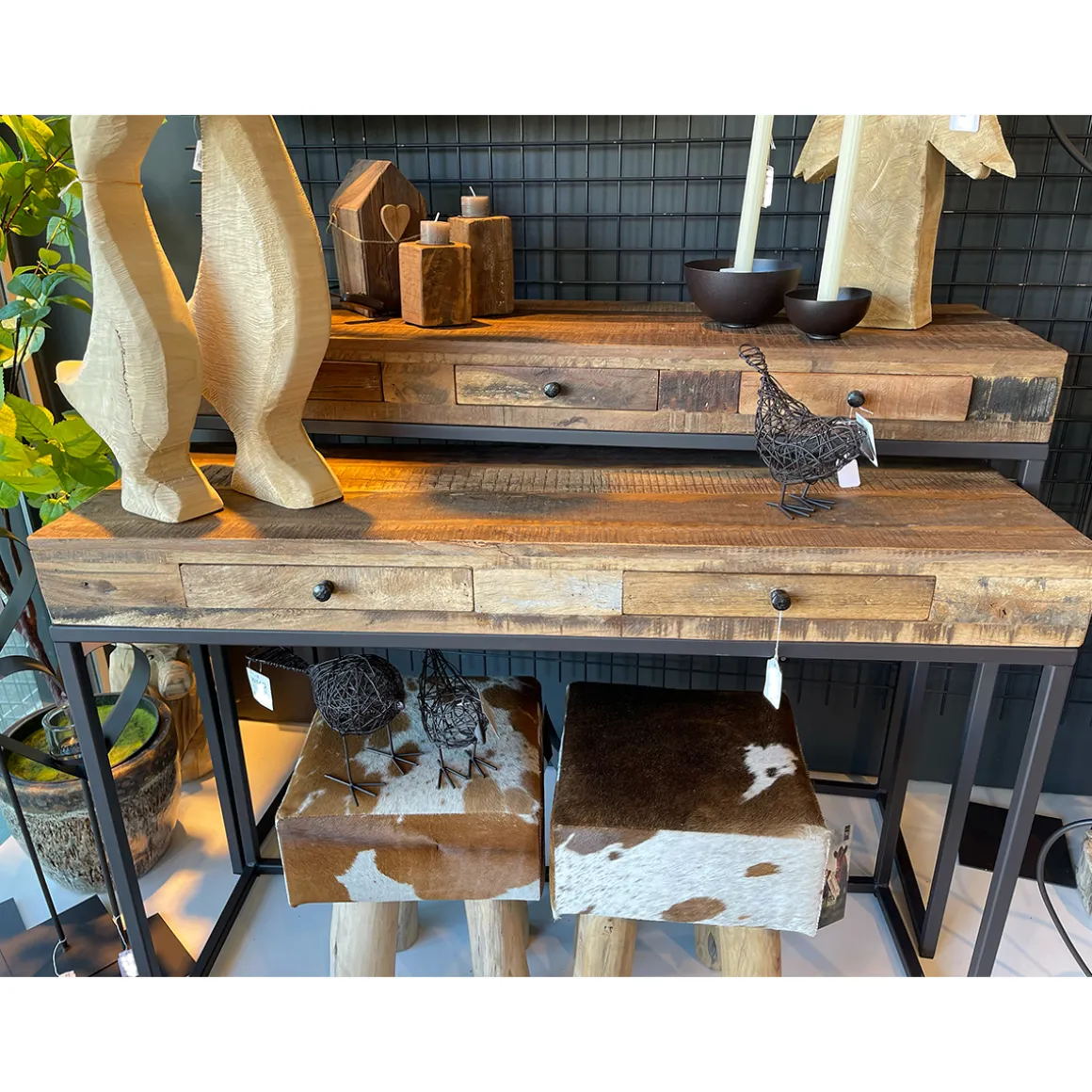 Eisen-Naturholz Konsole Victoria, rustikale Altholz Konsole mit 2 Schubladen auf Eisengestell, 75x110cm, WMG Grünberger