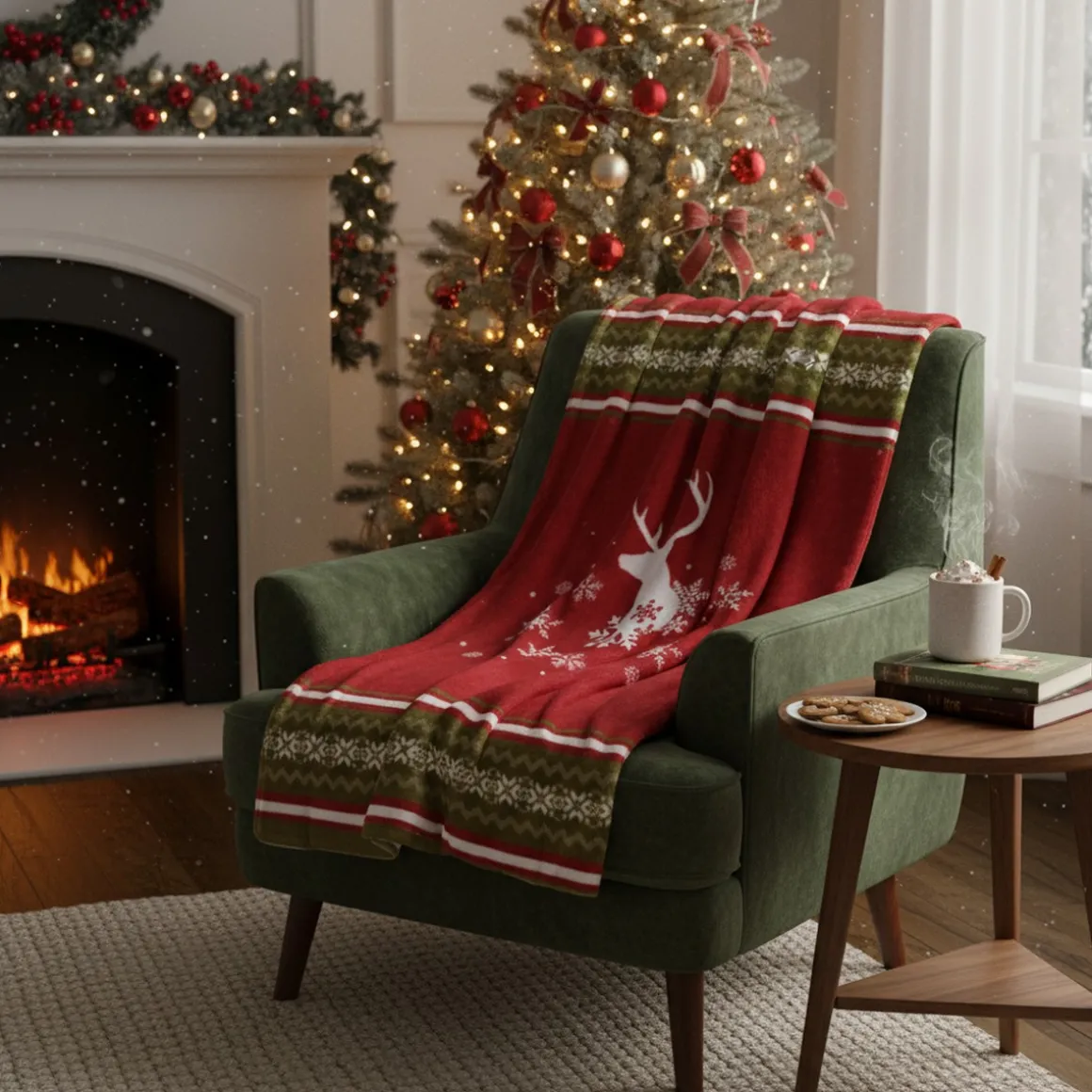 Das kräftige Rot, kombiniert mit weißen Eiskristallen und dezenten Mustern in Grün und Creme, sorgt für festliche Gemütlichkeit – perfekt für kalte Abende vor dem Kamin oder eingekuschelt auf der Terrasse.