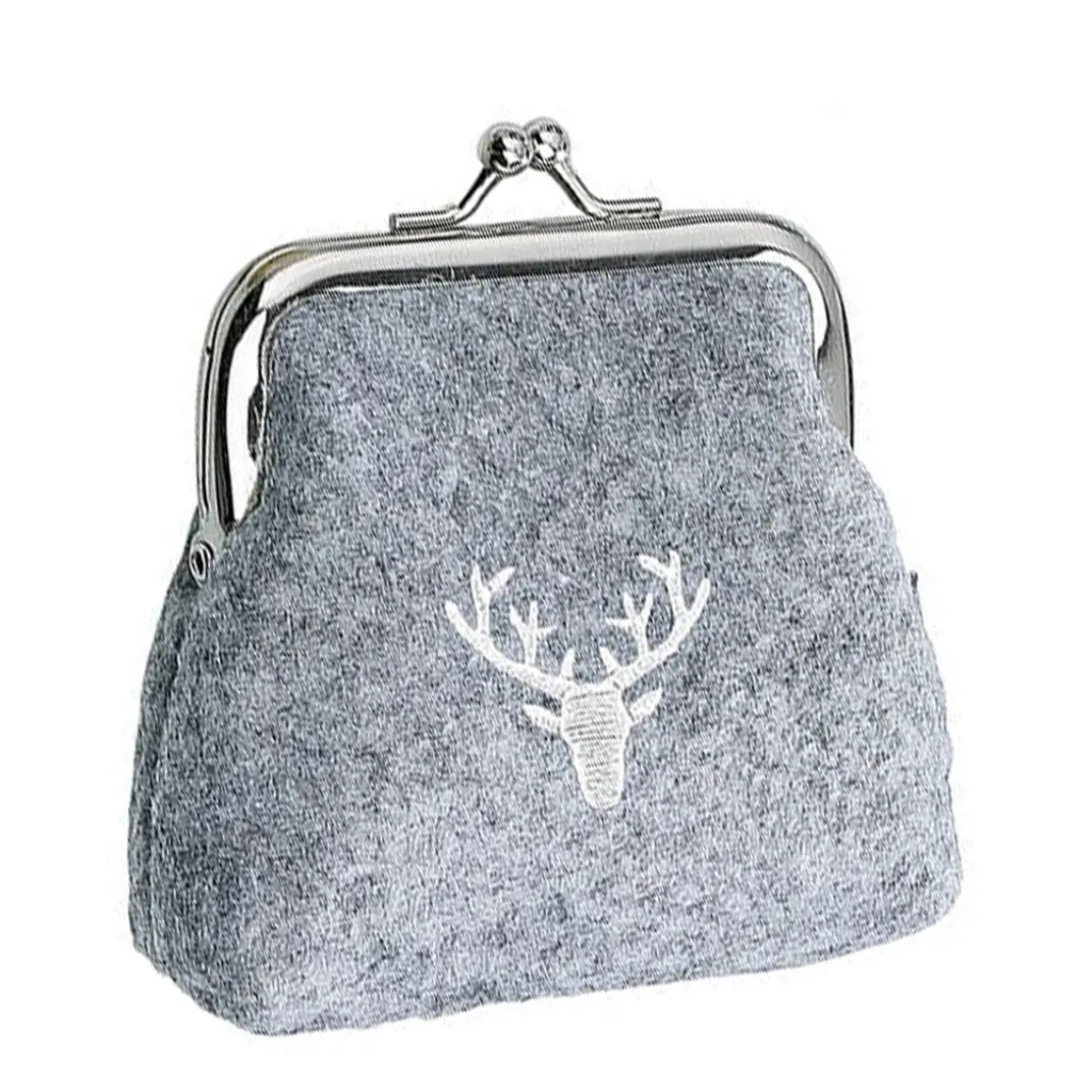Geldbeutel Hirsch, Portemonnaie aus Filz mit Hirsch, Klippverschluß, helles grau, 10x10cm, Gilde Handwerk