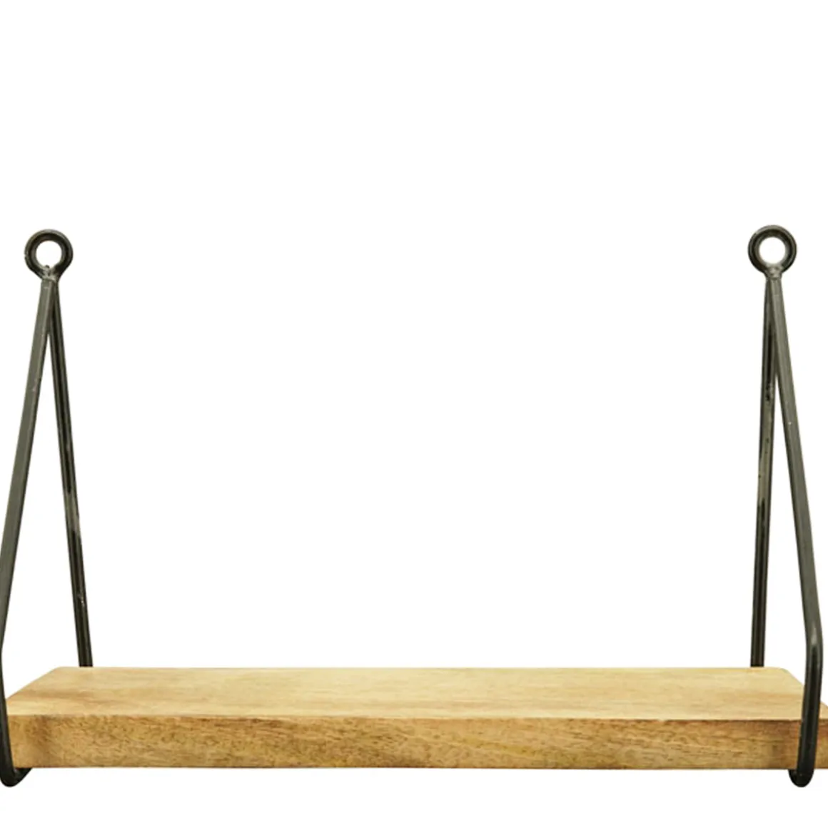 Das naturbelassene Holzbrett bringt Wärme in den Raum, während die schlichten Metallbügel für eine stabile und stilvolle Aufhängung sorgen.