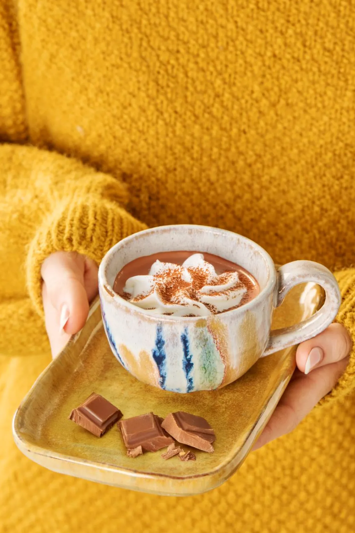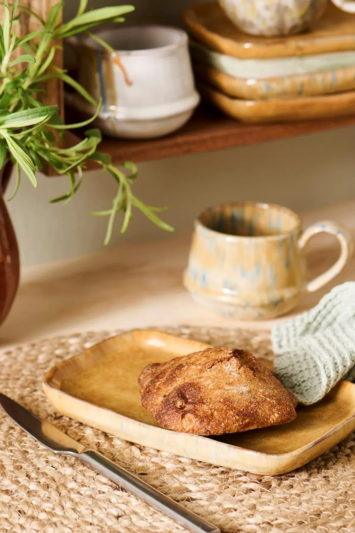 Dieses längliche Steinguttablett zeigt sich in einem warmen Mustard-Ton, der sofort Gemütlichkeit und natürliche Wärme ausstrahlt.