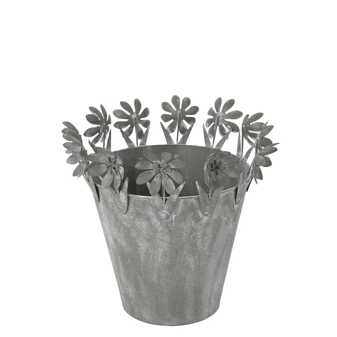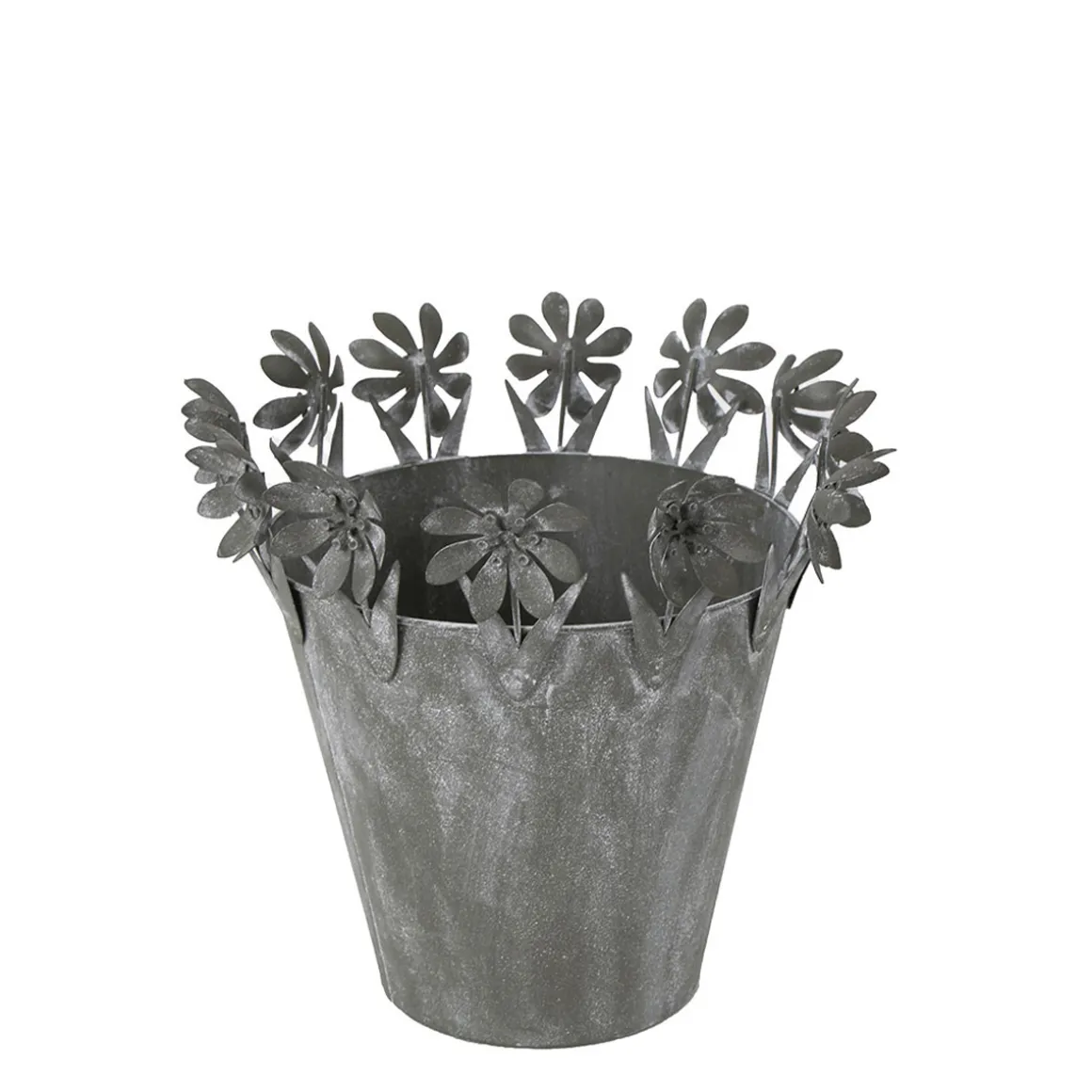 Übertopf mit Blumenrand, Zinktopf mit filigranen Blumen chabby chic grau, 15x13cm