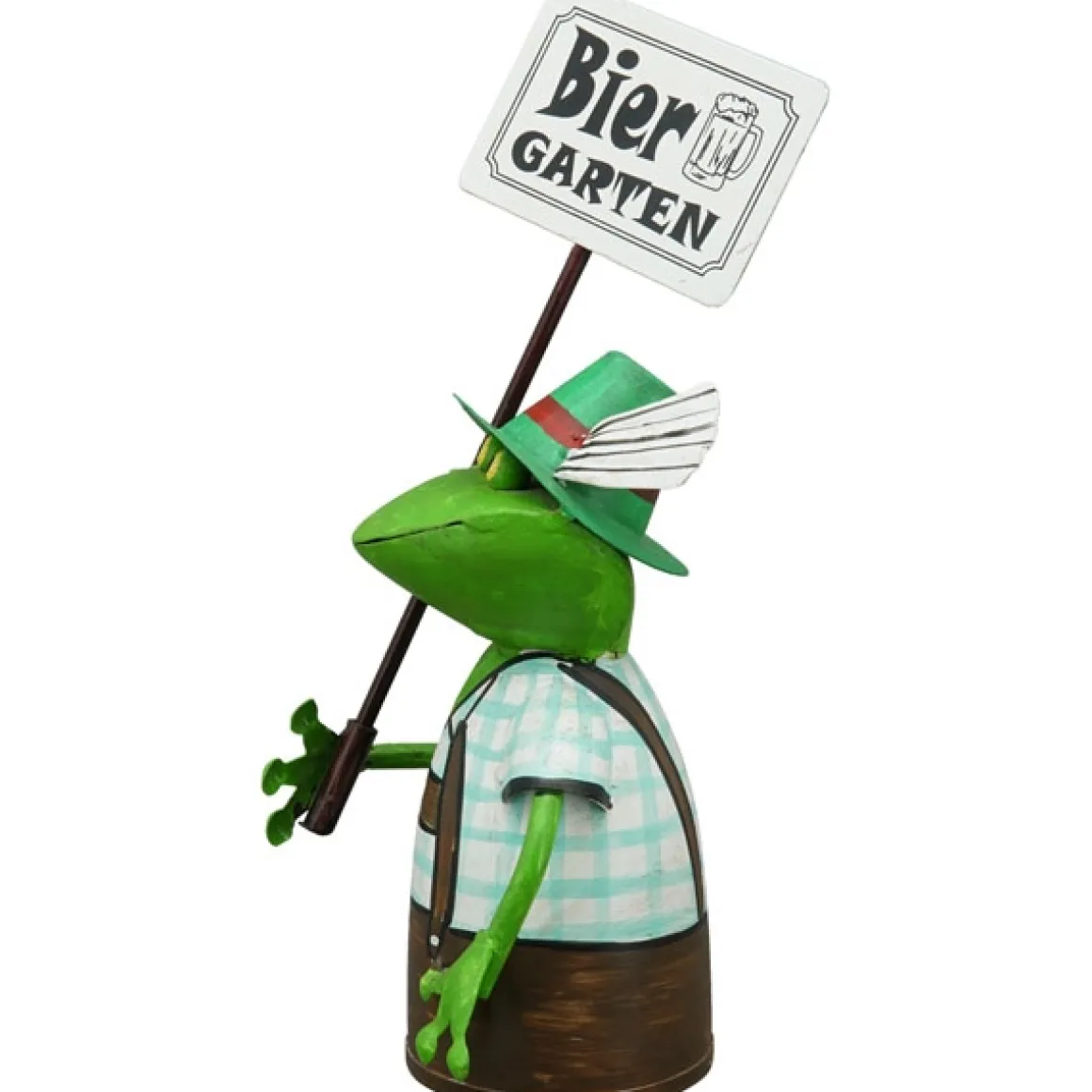 Produktinformationen „Zaunhocker Frosch Tracht, Metallfrosch in Lederhose mit Schild Biergarten, 30cm“