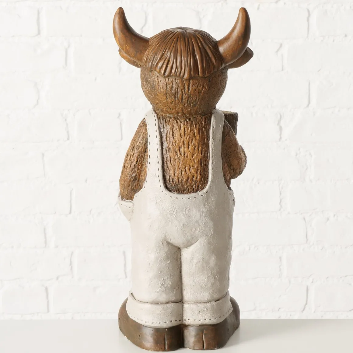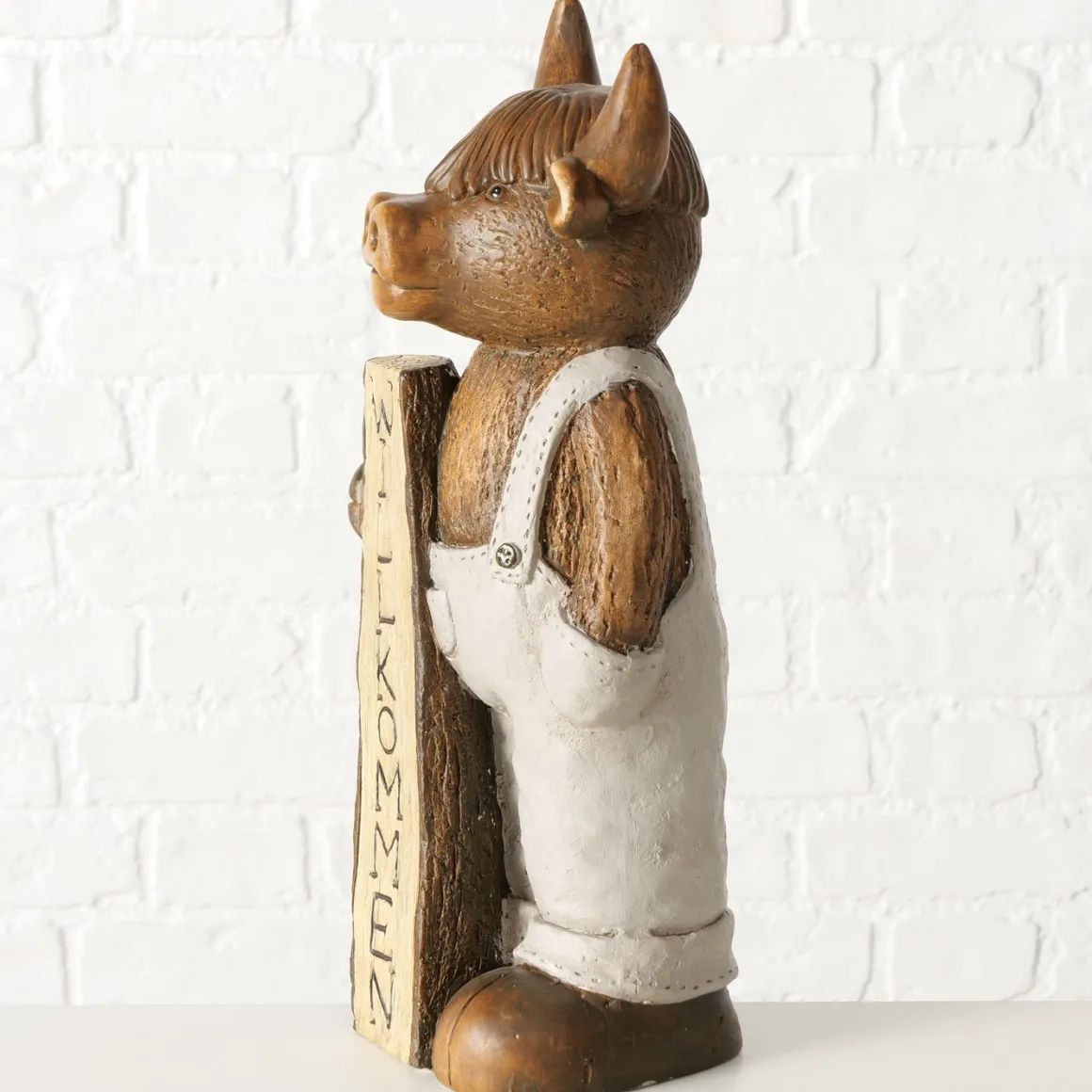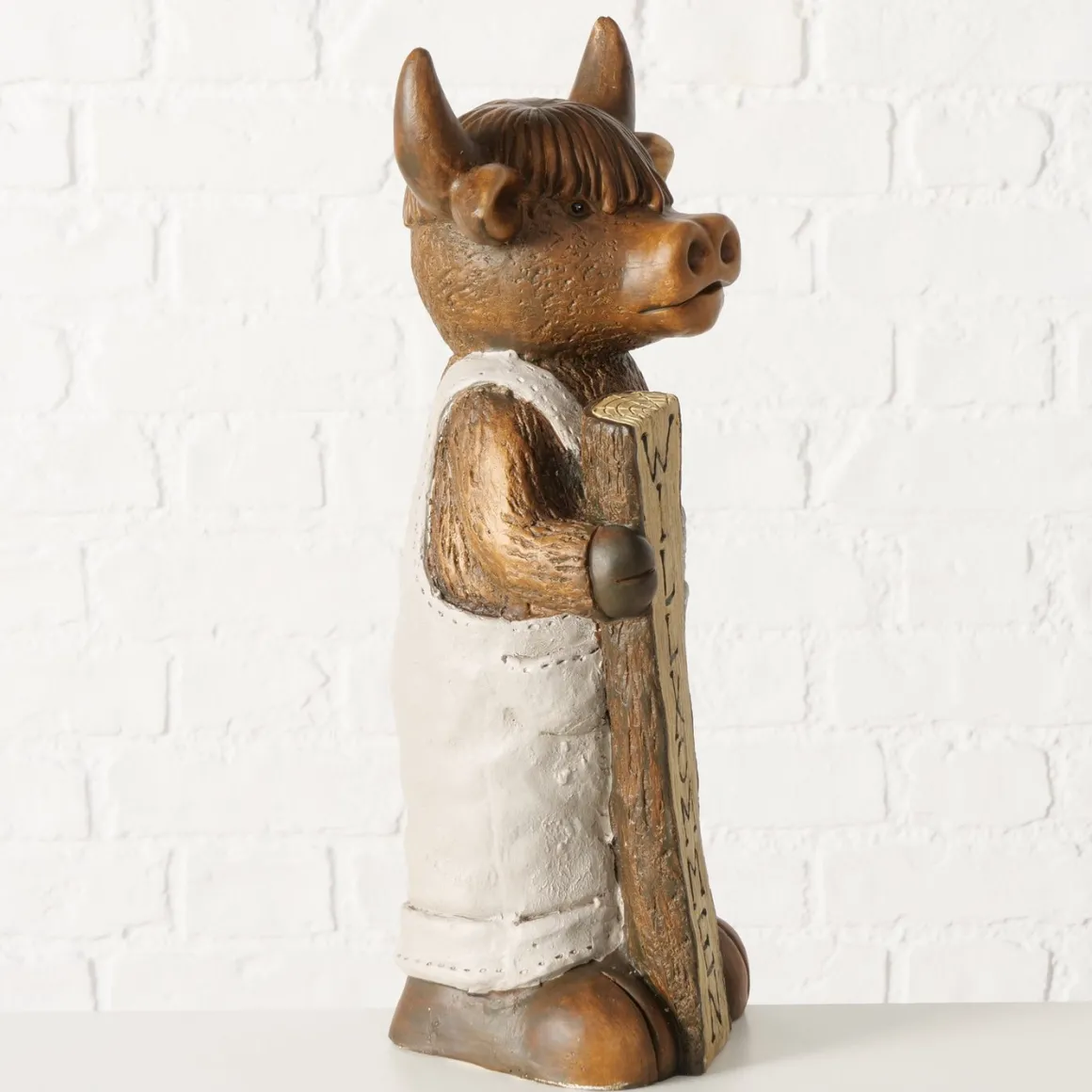 Deko Figur Schottisches Hochlandrind Buffi Willkommen, Hochlandrind mit Latzhose und Schild, Boltze Home Collections