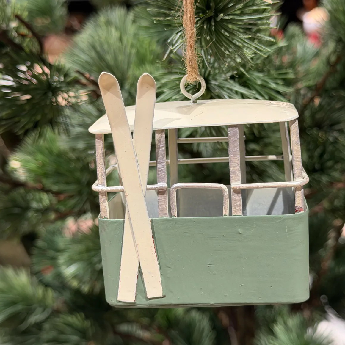 Produktinformationen „Deko Gondel mit Ski, kleine Seilbahn, rot, grün, blau oder gelb, Skigondel aus Metall, Hänger“