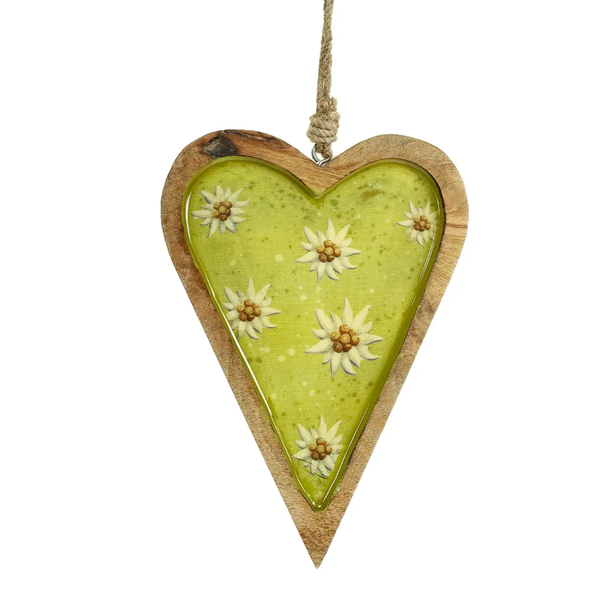 Deko Herz Landhaus, Holzherz hellgrün mit Edelweiß, Emailleoptik, 14x19cm, Hänger