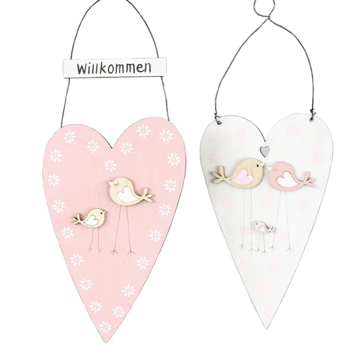 Deko Herz Willkommen, Holzherz rosa mit Vögel und Blumen, 27x11cm, Hänger