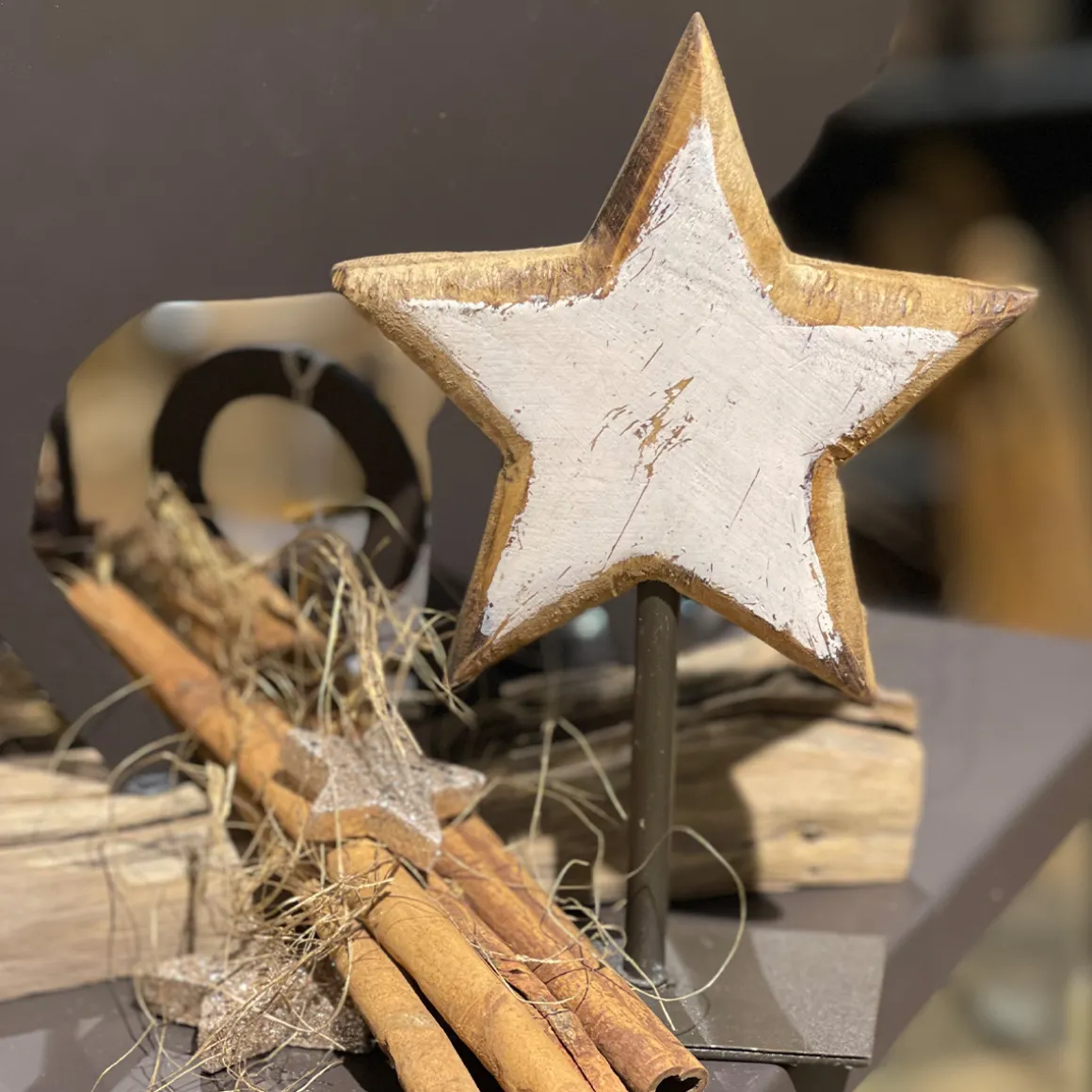 Deko Holzstern, Stern used look unfinished auf Metallständer, natur-creme, 19cm