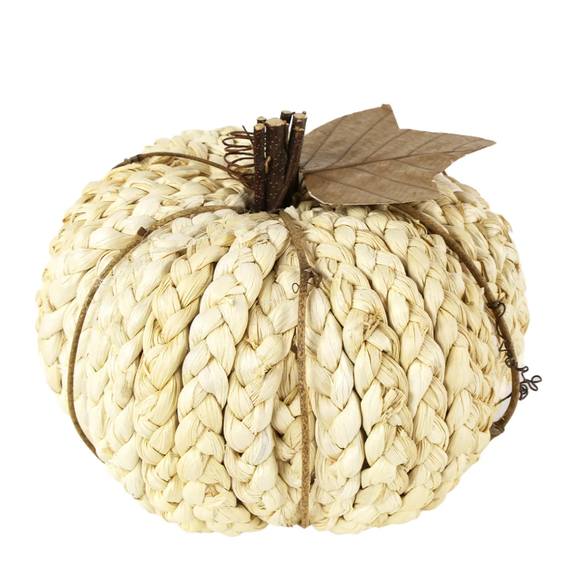 Deko Kürbis, Kürbis aus Maisstroh geflochten, mit Holzstil und Blatt, 17cm