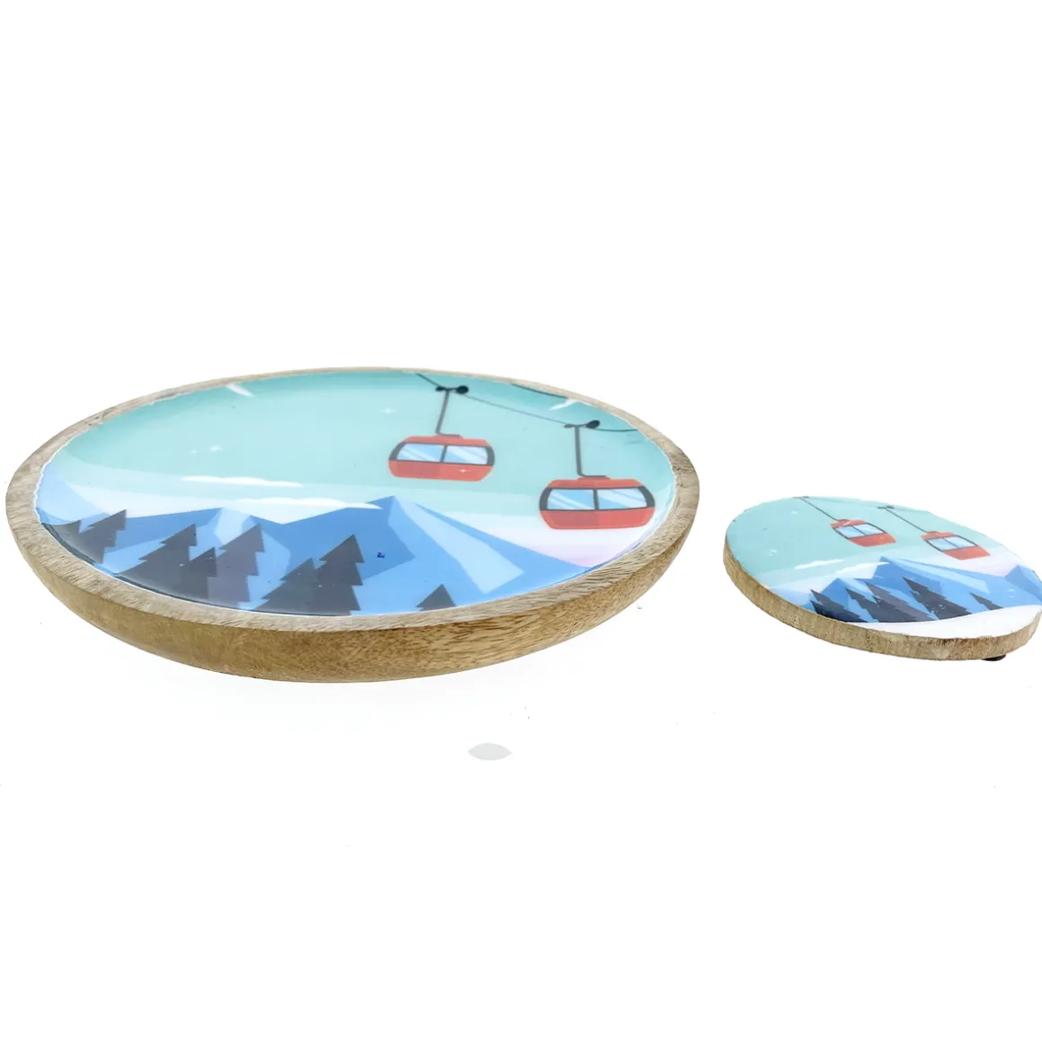 Deko Teller Gondel, Holzteller mit Lackküberzug und Bergmotiv mit Seilbahn, Ø30cm