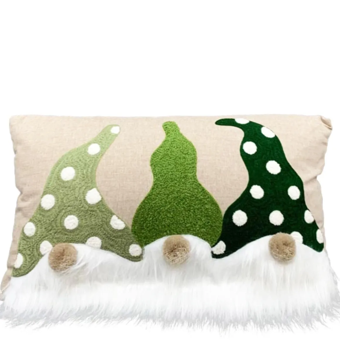 Die drei kleinen Weihnachtswichtel mit ihren grün gepunkteten Mützen, flauschigen Bärten und niedlichen Pommel-Nasen verleihen dem Kissen einen verspielten, charmanten Look.