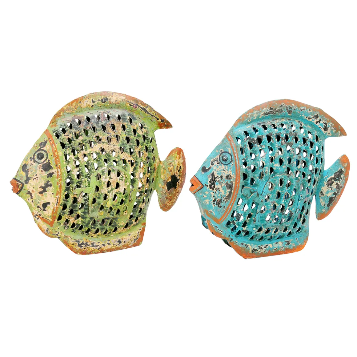 Deko Windlicht Fisch blau used look, Metallfisch mit kleinem Türchen, 31x24cm