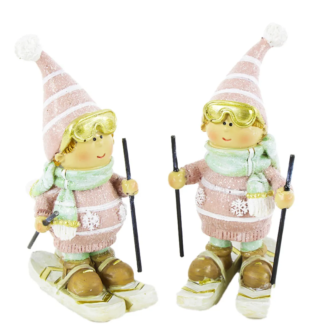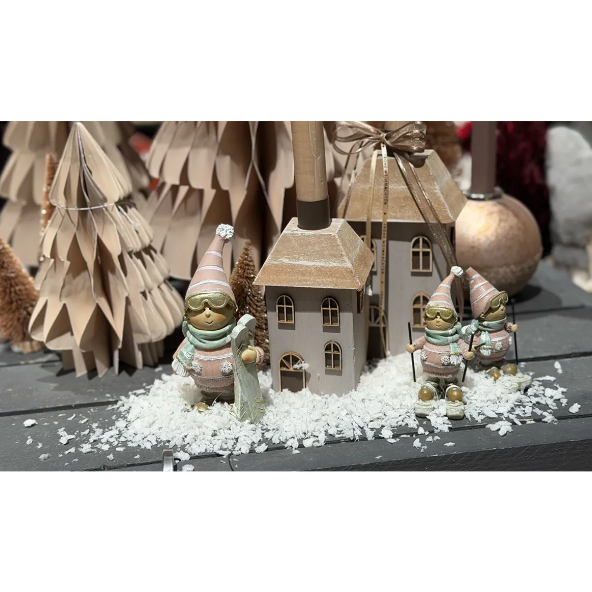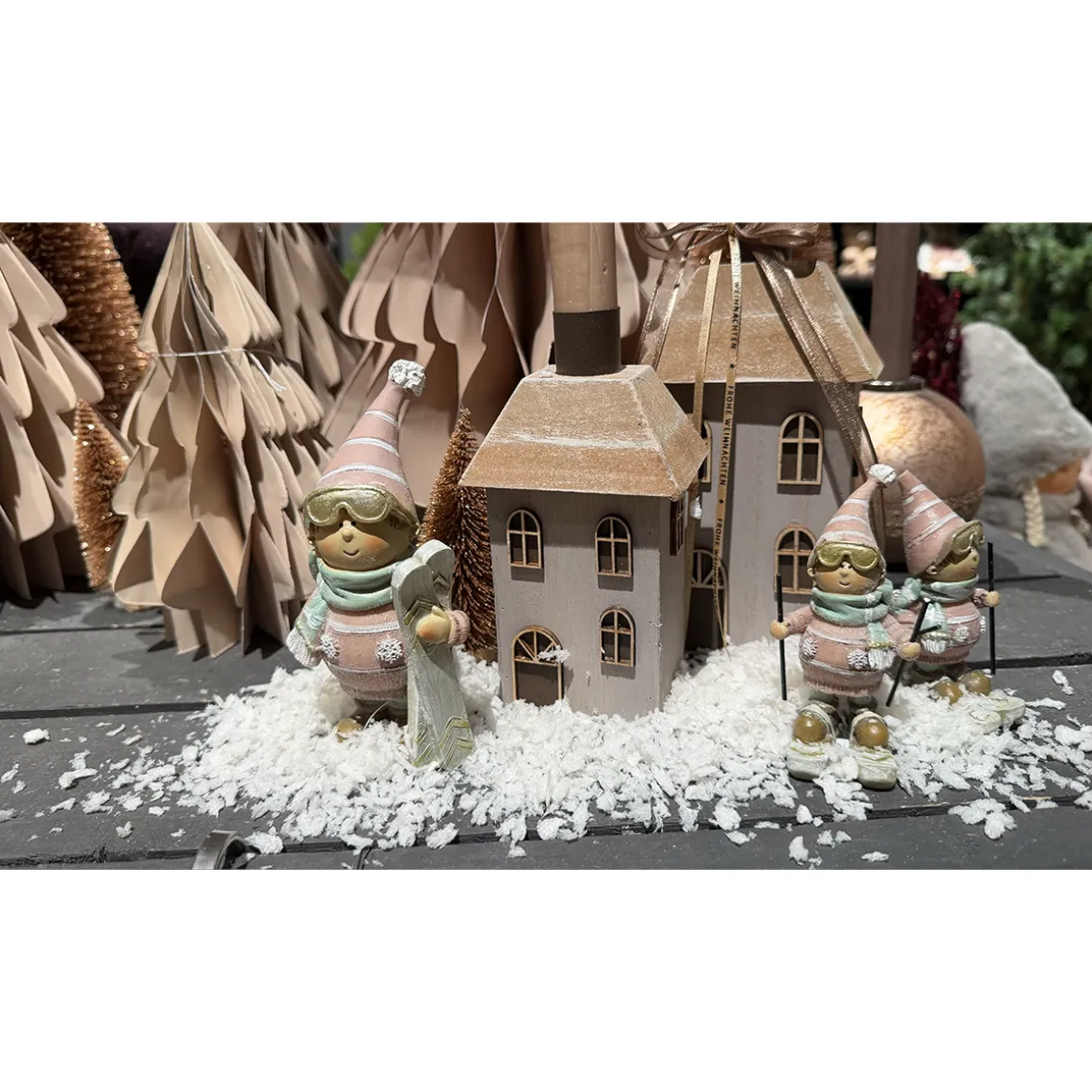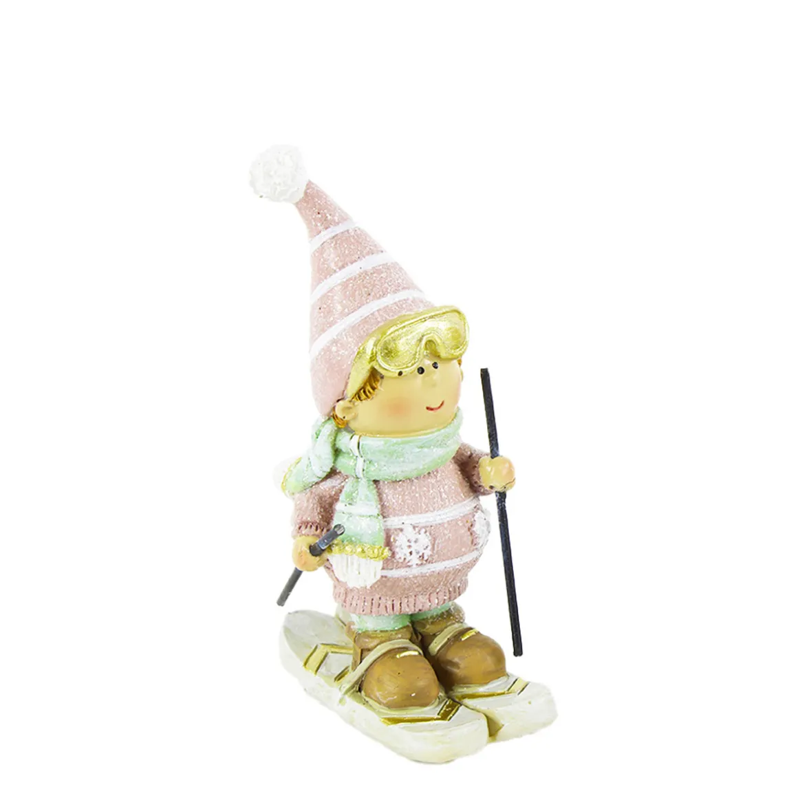 Mit Skibrille, warmem Schal und den Skiern in der Hand ist es bereit für ein kleines Schneeabenteuer – gut ausgerüstet, niedlich und schlicht zugleich. Die sanften Rosa- und Minttöne verleihen der Figur einen modernen, freundlichen Charakter, während der große Pulli für den typisch gemütlichen Winterlook sorgt.