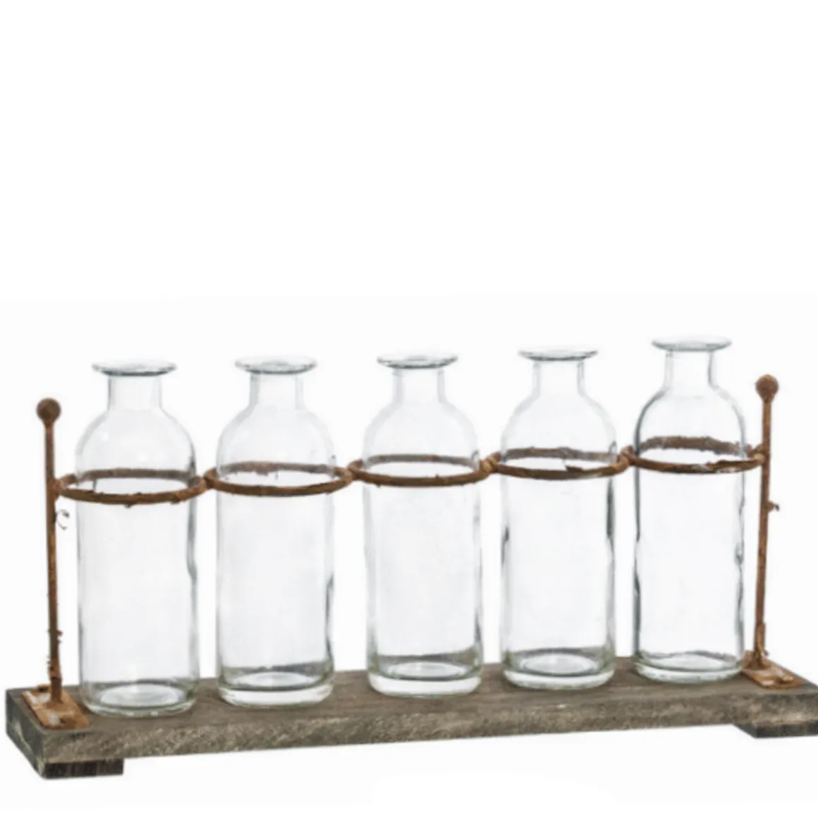 Produktinformationen „Glas Blumenvasen im Gestell, Eisengestell mit 5 Glasvasen, Rost used look, 39cmx19cm“
