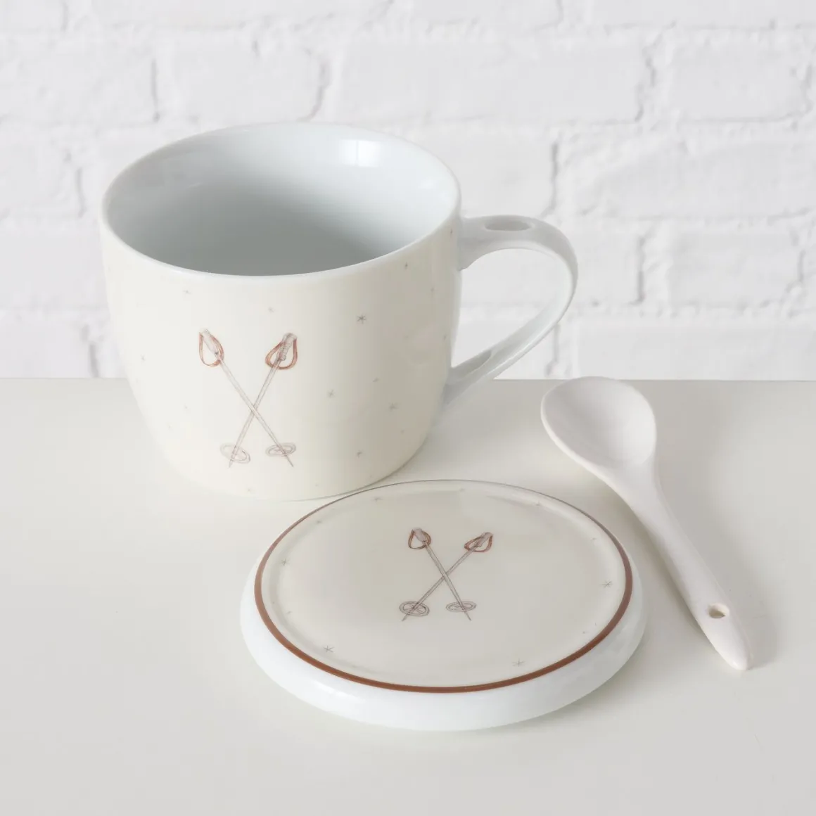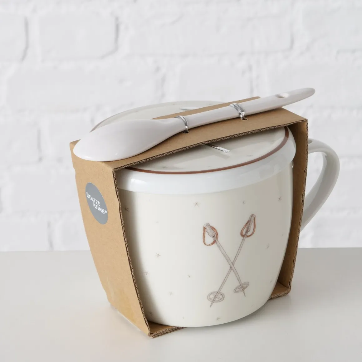 Jumbobecher Mountains Skistöcke, Henkelbecher mit Löffel und Deckel, 600ml, Boltze Home Collections
