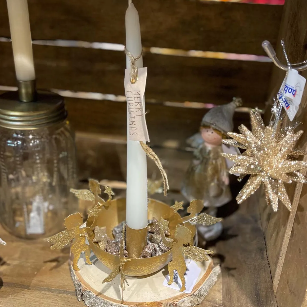 Die goldene Metallschale ist rundum mit kleinen Engeln verziert, die zarte Sterne in den Händen halten und eine warme, festliche Atmosphäre schaffen. Der unregelmäßige used look verleiht dem Kerzenhalter eine besonders charmante, leicht nostalgische Ausstrahlung – wie aus einer liebevoll geschmückten Winterstube.