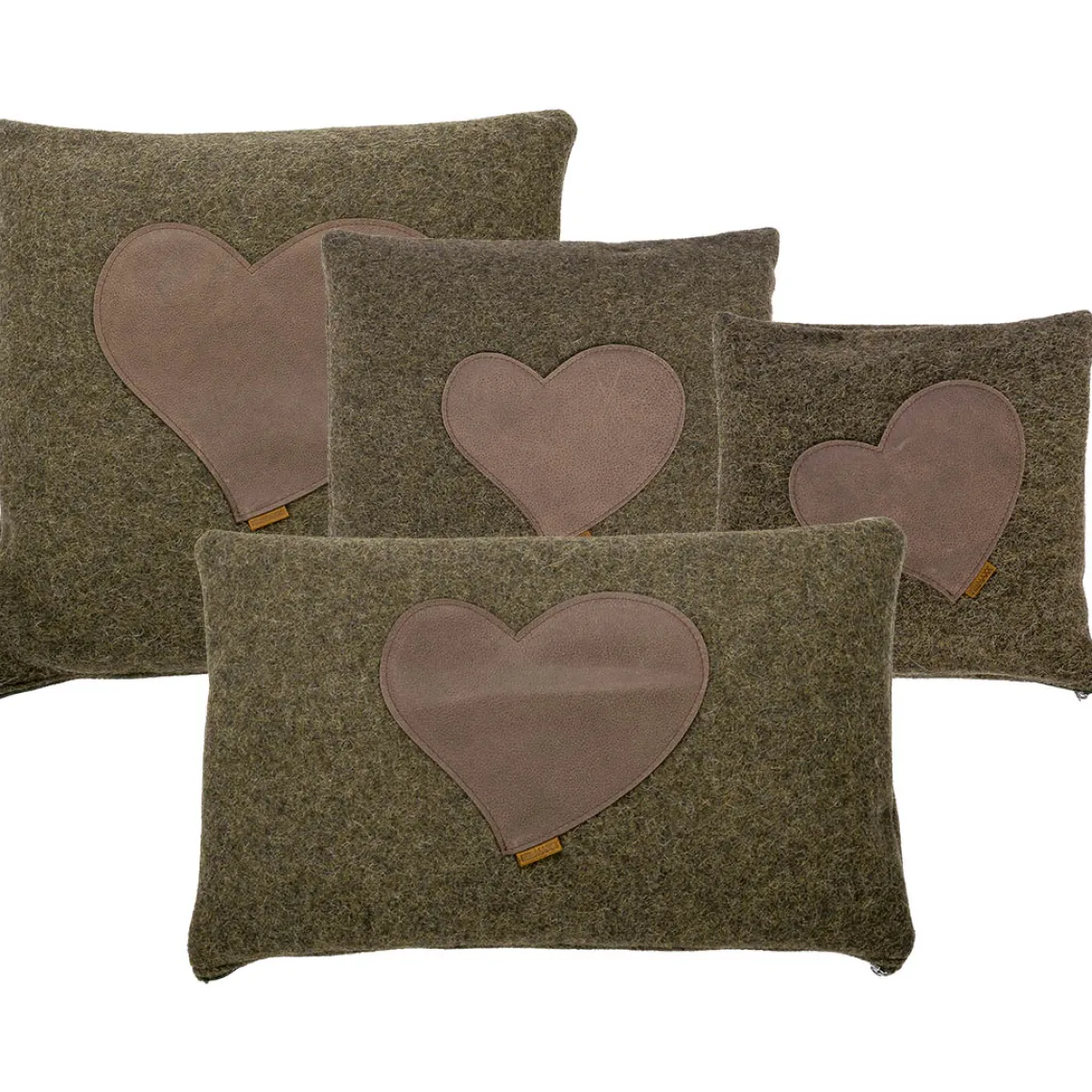 Der weiche Alpaca-Loden in warmem Moosgrün wird durch eine liebevoll gearbeitete Herzapplikation aus naturbelassenem Leder veredelt –ein stilvolles Detail, das jedes Sofa, Bett oder Landhaus-Interieur aufwertet.