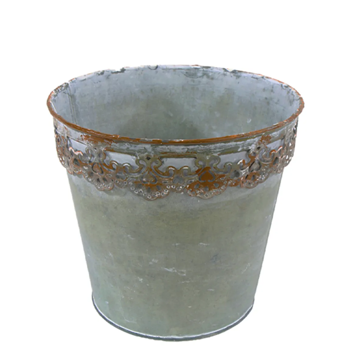 Pflanztopf mit Spitzenrand, Zinktopf grau used look, 12x11cm