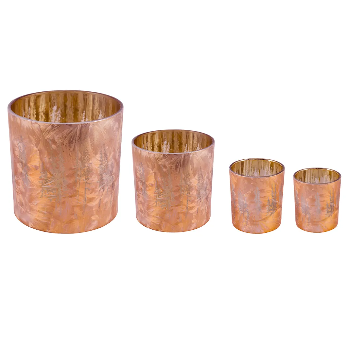 Windlicht Winterwald kupfer, Glaswindlicht mit Tannenbaum-Motiv, durchscheinend, 15cm